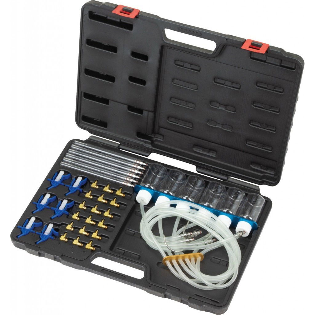 6 db üvegcső, 6 db mérőpatron 70 cm-es összekötő vezetékekkel, alumínium rúdra szerelve horgokkal, 24 db adapter Denso C3, C1, Siemens C3, Delphi, Bosch, stb.